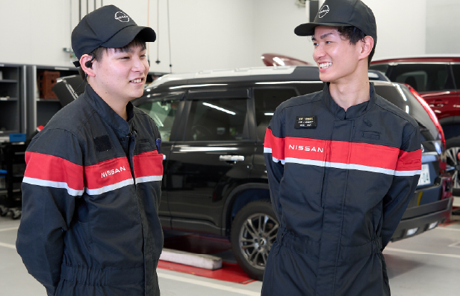 兵庫日産では、国家資格取得支援やメーカー研修、社内勉強会など、整備技術を高めるための制度が充実しています。先輩テクニカルスタッフとのOJTで実務経験を積みながら、専門知識を段階的に身につけられる環境です。技術の進化や環境・安全基準に対応するための研修もあり、学び続けることで自信と技術力を高めていけます。機械の仕組みや工具の使い方はもちろん、整備手順の合理化や診断力も育てられます。